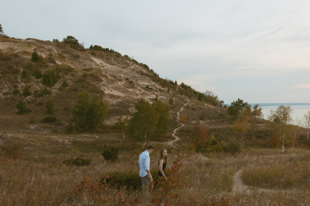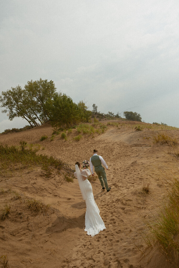 Probably one of the most iconic and also the largest areas, Sleeping Bear has a HUGE variety of scenery to explore for an elopement! Most areas are fairly accessible via the Pierce Stocking Scenic drive, which costs $25 to enter the park through. There are so many trails you can explore in the park with different distances and views as well! You can adventure to inland lakes, beautiful fern meadows, tall pine forests, and of course the seemingly endless expanse of dunegrass trails on the dunes themselves!