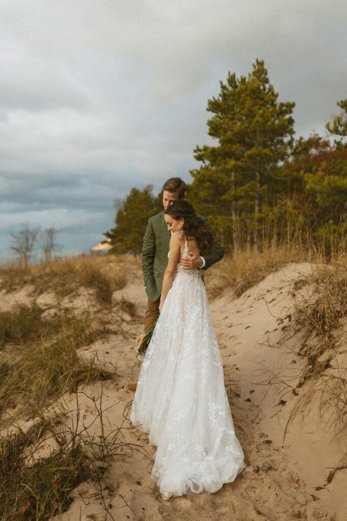 Probably one of the most iconic and also the largest areas, Sleeping Bear has a HUGE variety of scenery to explore for an elopement! Most areas are fairly accessible via the Pierce Stocking Scenic drive, which costs $25 to enter the park through. There are so many trails you can explore in the park with different distances and views as well! You can adventure to inland lakes, beautiful fern meadows, tall pine forests, and of course the seemingly endless expanse of dunegrass trails on the dunes themselves!
