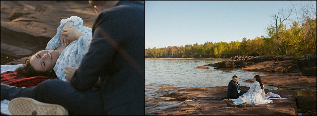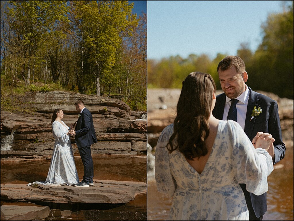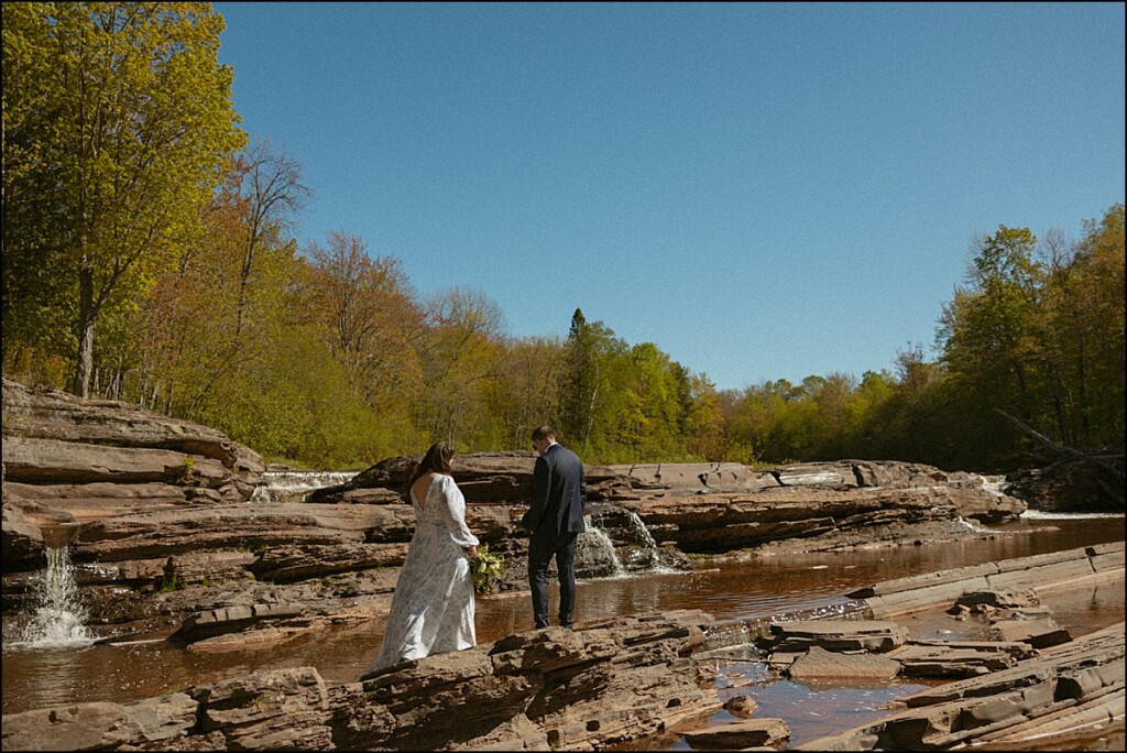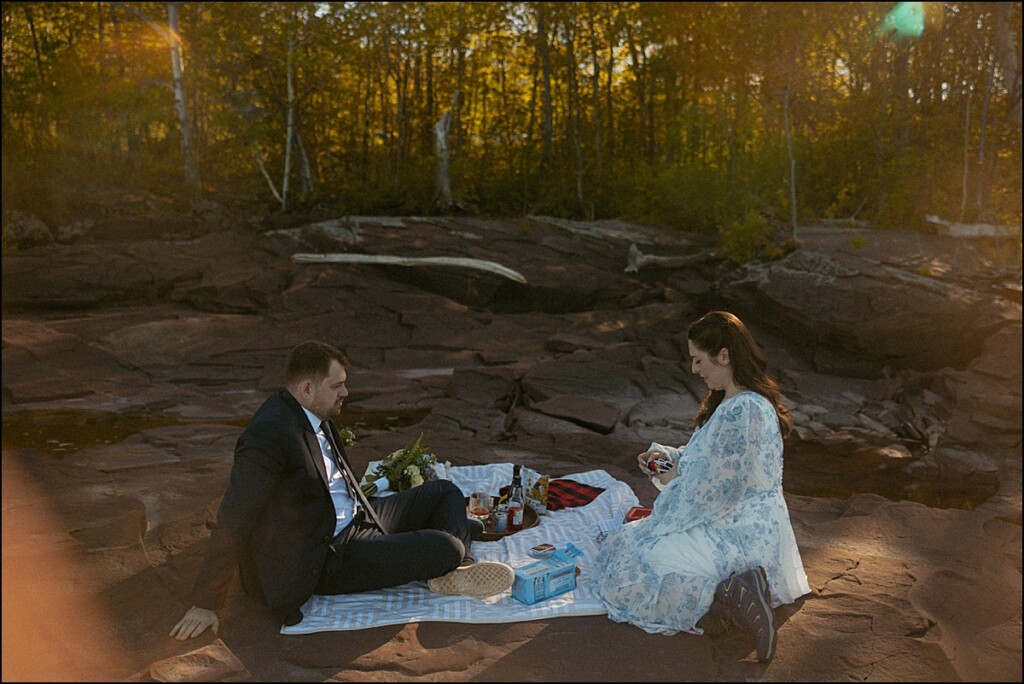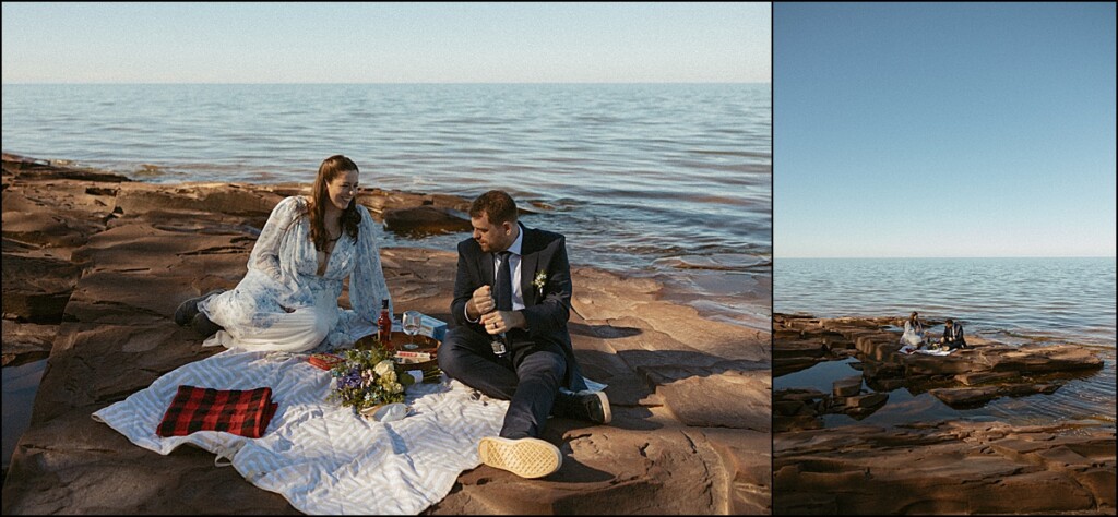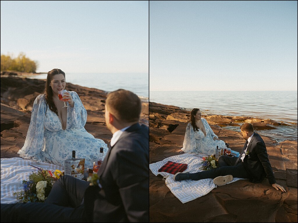 After the ceremony, Tess + Curran wanted to share a little adventure with just the two of them. We ventured out to a local waterfall, where we spent some time exploring and they exchanged private vows in front of the falls. We then wandered over to the Lake Superior shoreline for a picnic along the water, and a couple of rounds of uno! Adding experiences like that is one of the best parts about eloping. You can really make your day 100% your own, and do whatever you want!!