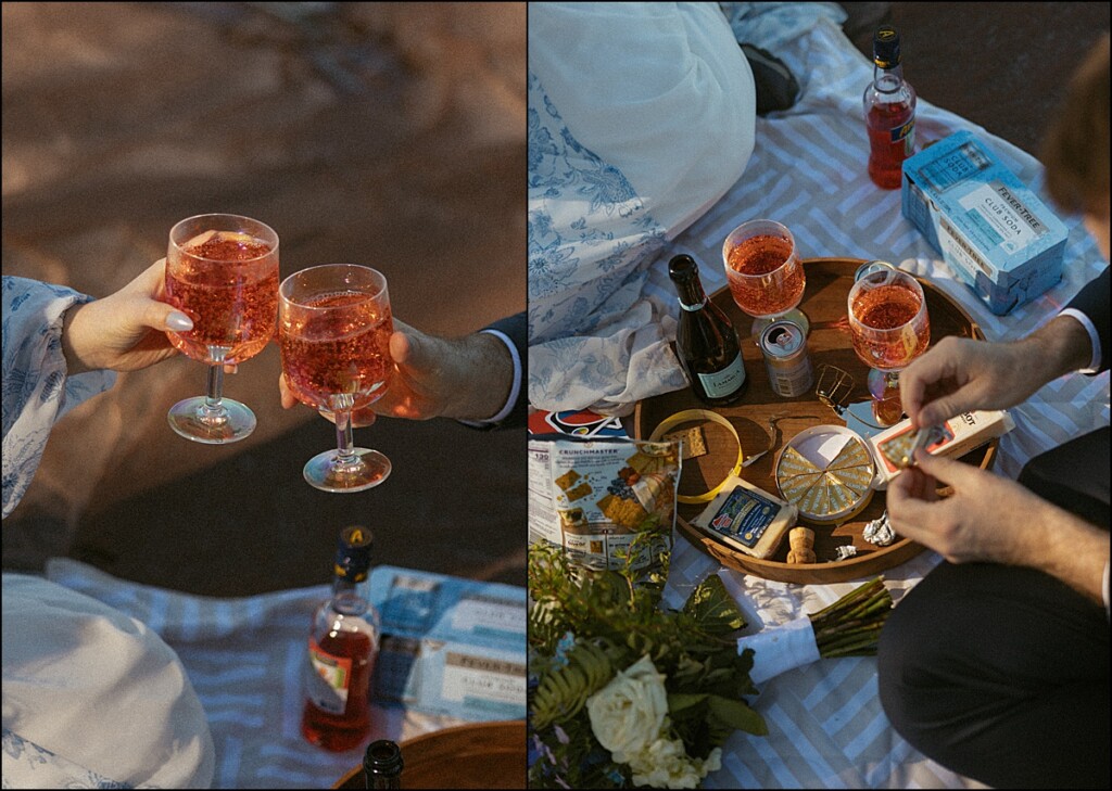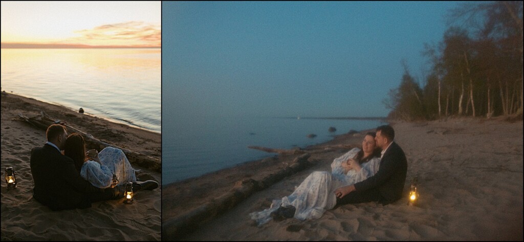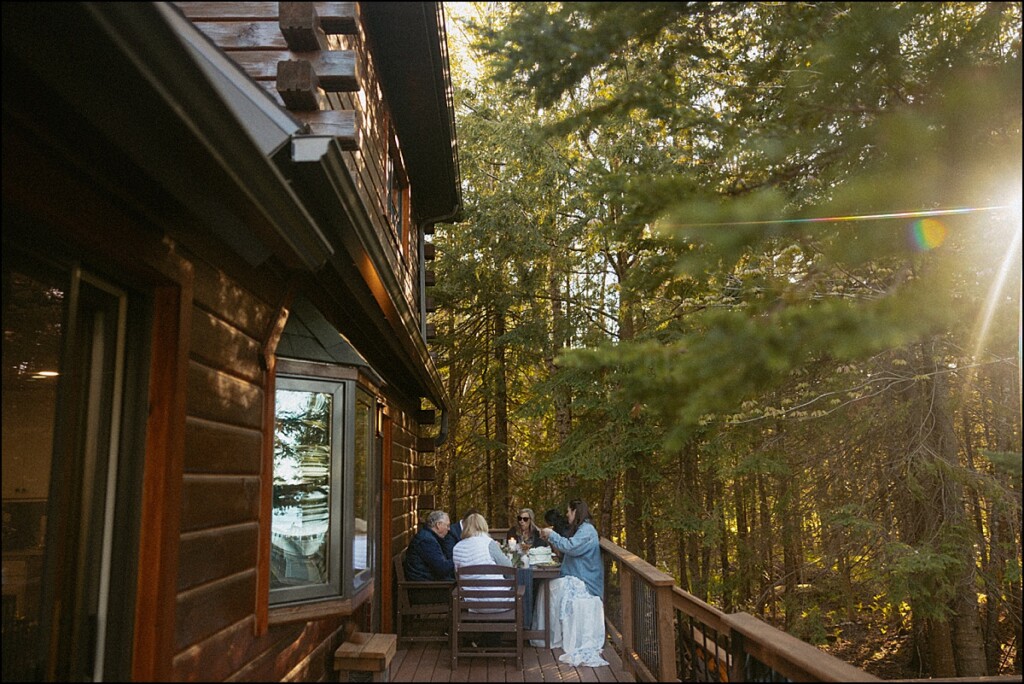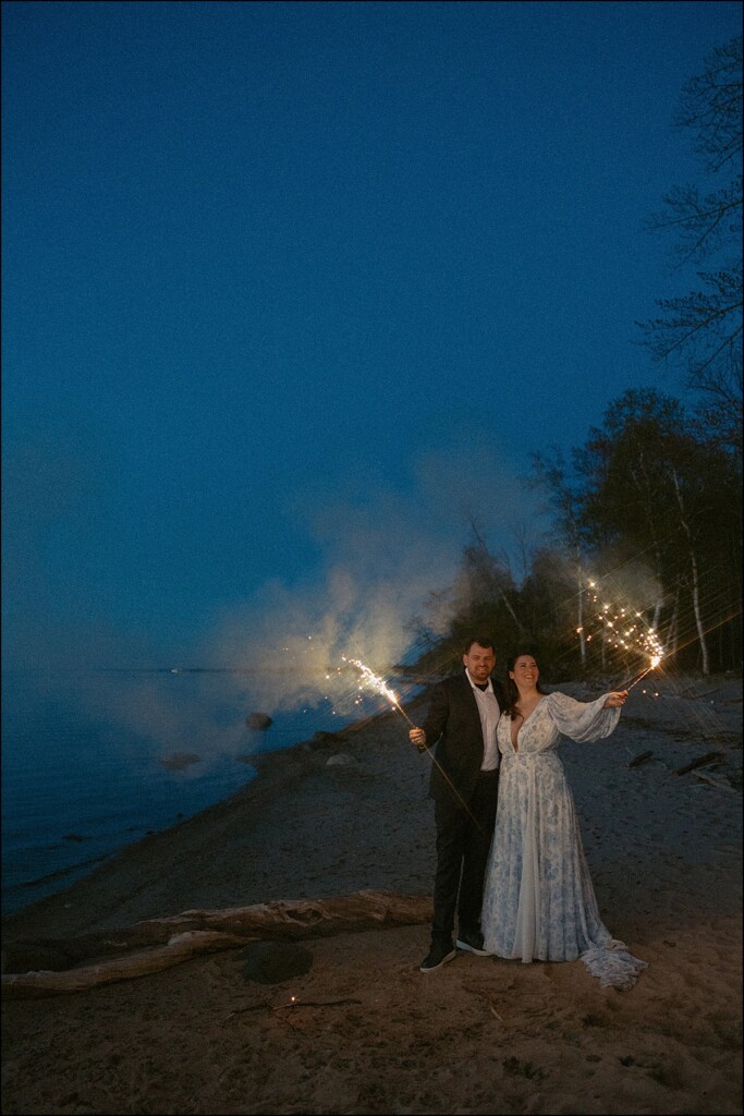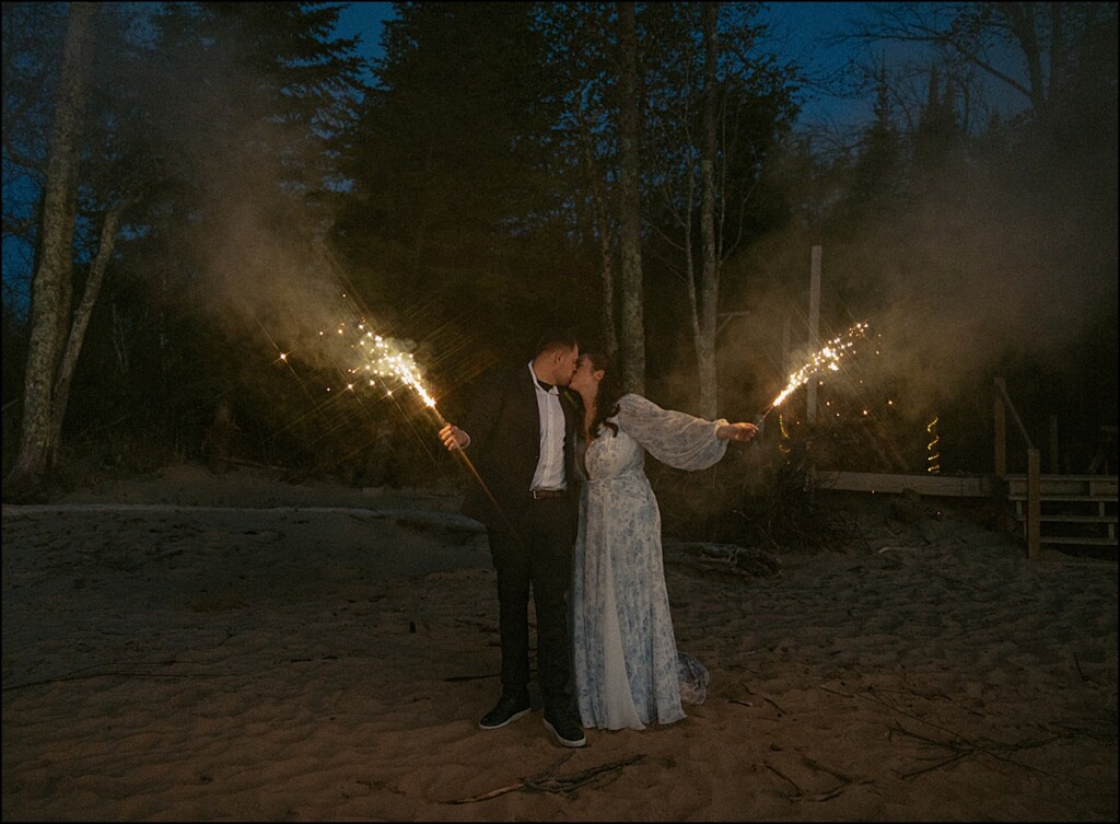 To say the day ended with the BEST vibes would be an understatement. Tess + Curran followed up their mini adventures with pizza on the deck during golden hour with their families! After dinner they shared cake, champagne, and a bonfire on the beach before their families left to give them some time to take everything in and celebrate with just the two of them. To them, that meant snuggling up on the beach with some cocoa and playing with sparklers! One of the best parts about having a micro wedding or elopement is that you can truly make your day yours, and do whatever you want – which is exactly what these two did!